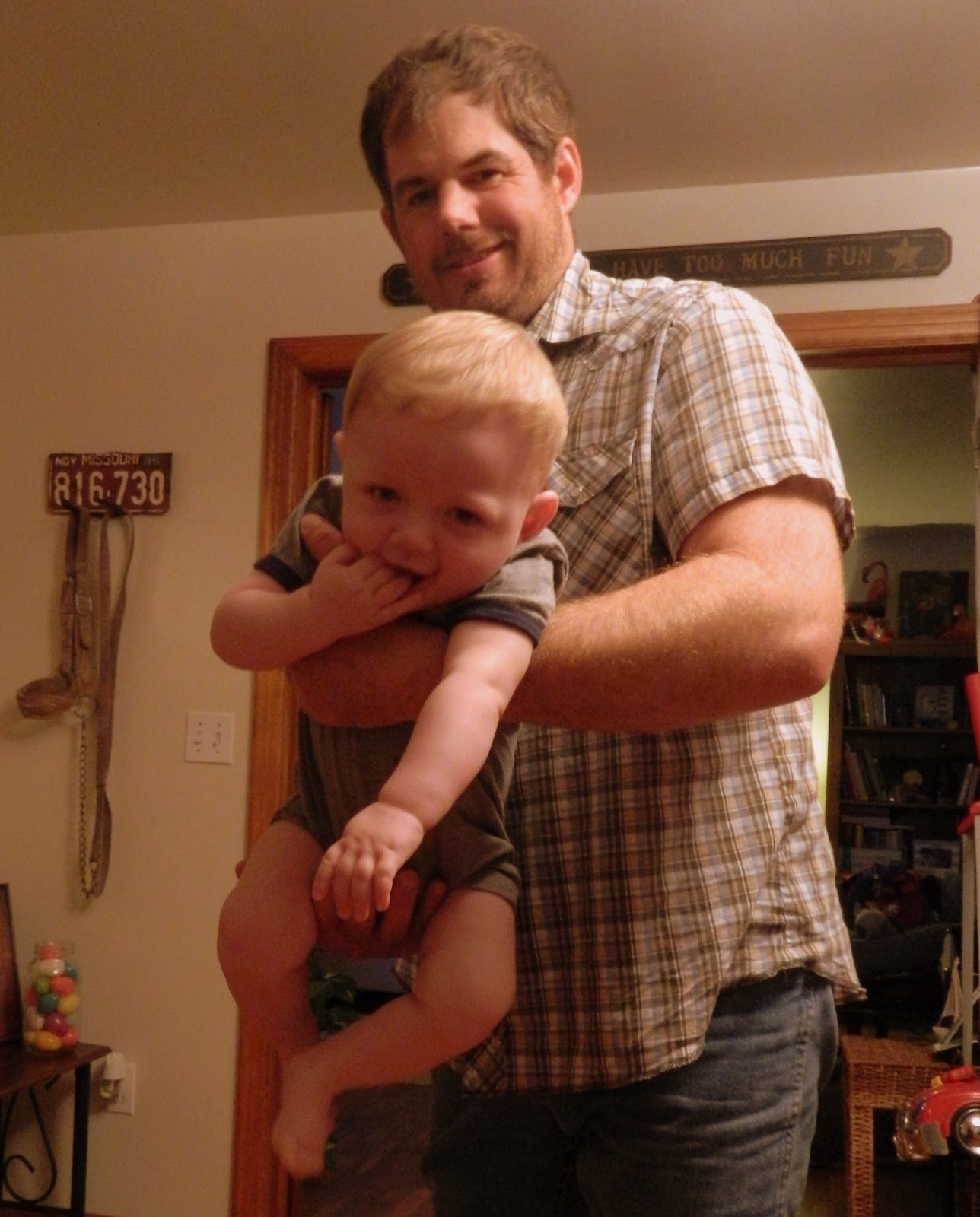 It's been a great week so far! A couple nights ago, I was working on supper and John laid Bruce down on his back in the living room. When he walked back in after a few moments, little man was on his belly! After a few months of PT, we have a roller! I immediately gave up on creating a culinary masterpiece and hid behind the door to catch him on video...within a few minutes, I had plenty of proof!